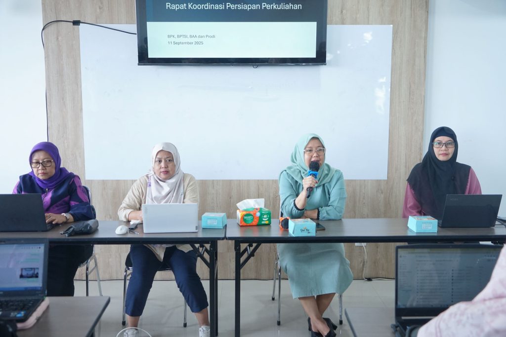 Rapat koordinasi ini menghadirkan tiga narasumber utama. Kepala BPK, Dr. Heni Jusuf, S.Kom., M.Kom., memaparkan tahapan input dan penyetaraan kurikulum. Kepala Badan Pengembangan Teknologi Sistem Informasi (BPTSI), Ariana Azimah, S.T., M.T.I., menjelaskan teknis penggunaan sistem akademik baru. Sementara itu, Kepala Biro Administrasi Akademik (BAA), Dr. Dra. Sri Handayani, M.Si., menekankan pentingnya akurasi data akademik agar layanan administrasi mahasiswa berjalan lancar.