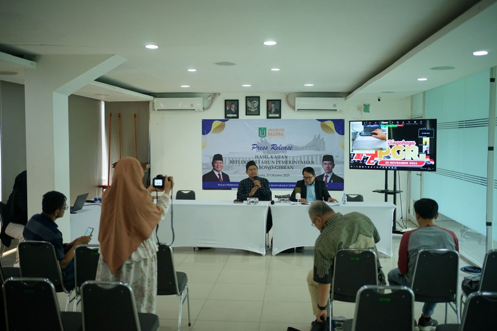 Jakarta (UNAS) – Pusat Penelitian dan Pengabdian kepada Masyarakat (P3M) Universitas Nasional (UNAS) menggelar kegiatan Rilis Hasil Kajian Setahun Jalannya Pemerintahan Prabowo–Gibran di Ruang Seminar Selasar Lantai 3 Universitas Nasional, Sabtu (19/10). Kegiatan ini merupakan bentuk refleksi akademik terhadap perjalanan pemerintahan selama satu tahun, dengan fokus pada evaluasi realisasi janji politik dan efektivitas kebijakan publik.