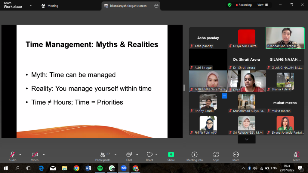 Dalam pemaparannya, Dr. Iskandarsyah Siregar menekankan pentingnya pengelolaan waktu dan efektivitas pribadi dalam dunia kerja yang penuh tekanan. “Kemampuan mengelola waktu dengan bijak adalah kunci untuk menjaga produktivitas dan menjaga keseimbangan hidup,” ungkapnya.
