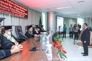 “Promotor yang diketuai Dr. Isbodroini Suyanto, M.A. telah menyampaikan keterangan mengenai pengembangan keahlian Saudara dan Ketua Program Doktor Ilmu Politik Universitas Nasional telah melaporkan hasil Ujian Proposal Riset, Ujian Hasil Riset, dan Ujian Pra Promosi Saudara. Berdasarkan semua itu, Tim Penguji Universitas Nasional memutuskan untuk mengangkat Saudara menjadi Doktor dalam Program Studi Ilmu Politik dengan yudisium Sangat memuaskan,” kata Umar Basalim. (MPR)